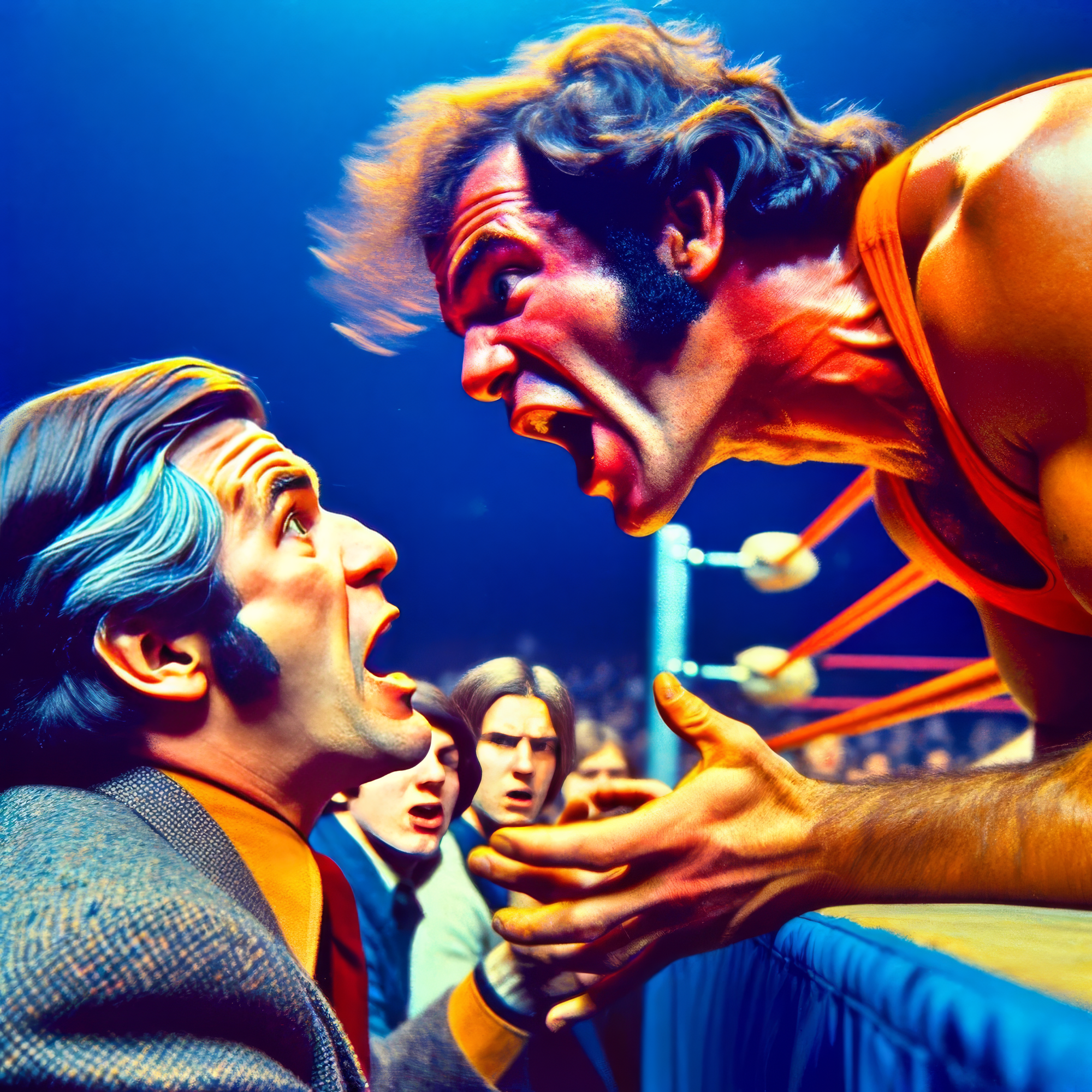 - Final Image Description: In this iconic 1970s sports photo, the controversial figure of "Steel Hammer" Hank Roberts is captured in a heated argument with a fan at ringside, vividly demonstrating his ability to stir strong emotions and remain a polarizing figure in the wrestling world. The image, taken during an intense moment, uses vibrant colors typical of the era, with every detail sharply rendered thanks to advancements in camera technology. The fast shutter speed freezes this dynamic interaction, highlighting the expressions of confrontation and engagement. Enhanced depth of field ensures both the wrestler and the fan are in sharp focus, drawing viewers into the emotionally charged scene. This photo, likely taken with a telephoto lens like the Canon FD 300mm f/2.8 on a Canon F-1 camera, captures the essence of 1970s sporting drama in high-speed color film, offering a crisp and vivid portrayal of this memorable moment.
